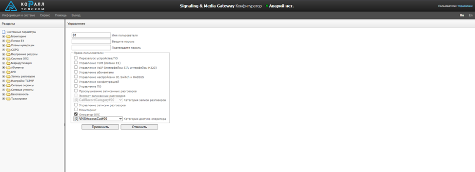 Настройте категории доступа оператора: Система ОЛС -> Категории доступа оператора.